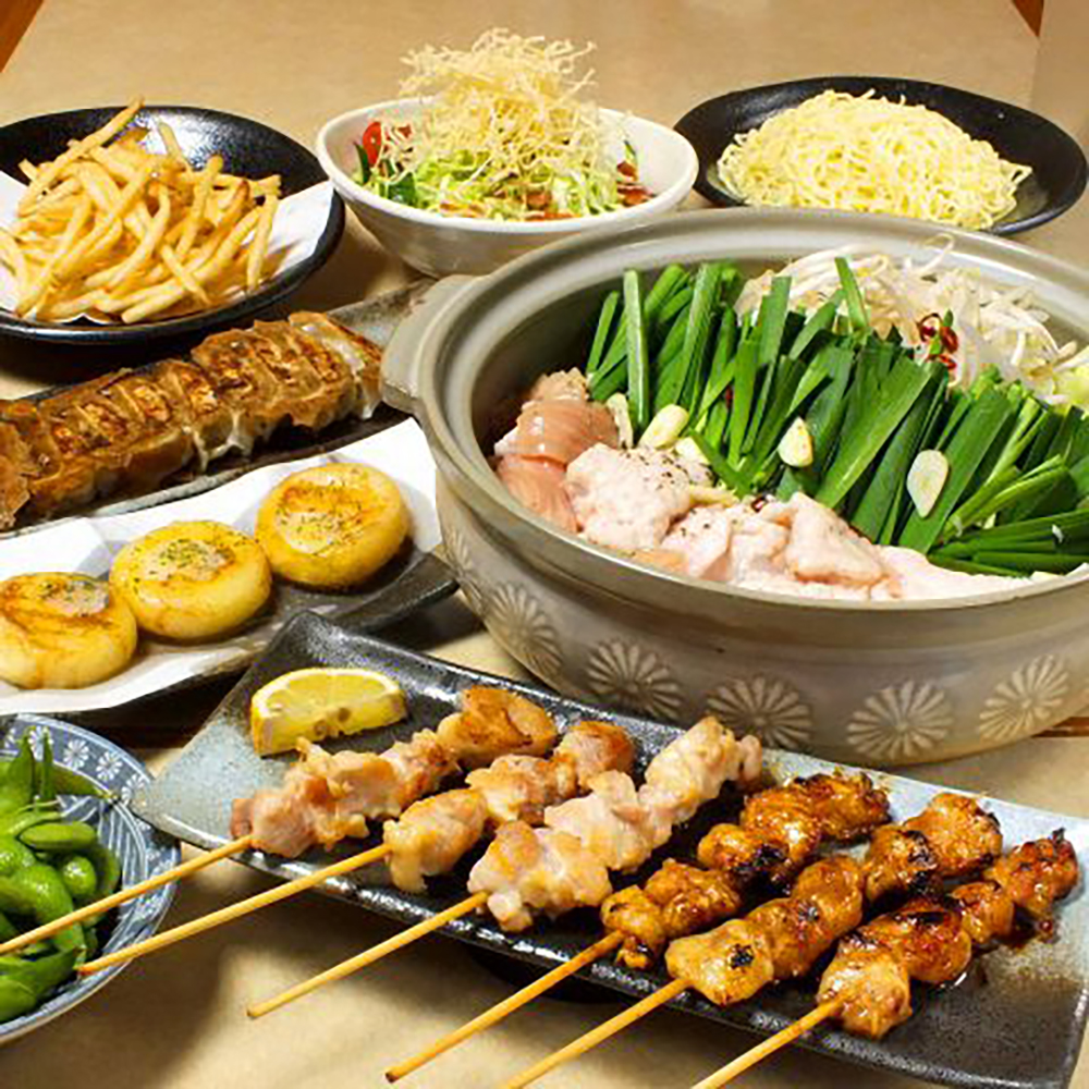 メインの「もつ鍋」を中心に、自慢の串焼きや人気のぎょうざ、揚げ物まで揃ったボリューム満点のフルコースです。